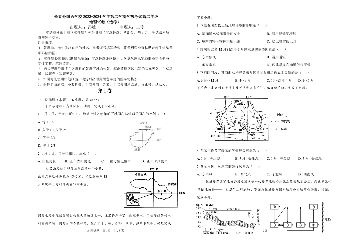 吉林省长春市朝阳区长春外国语学校2023-2024学年高二下学期开学考试地理+答案