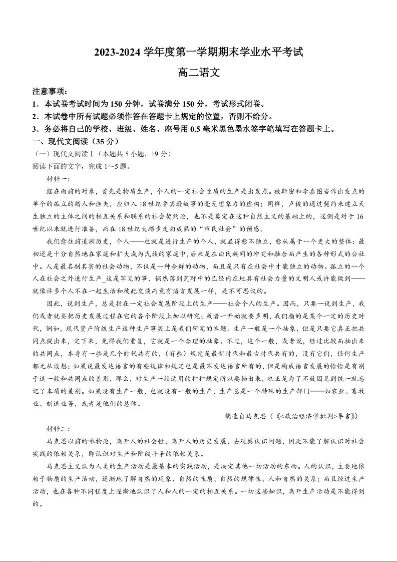 江苏省东台市2023-2024学年高二上学期期末考试语文+答案