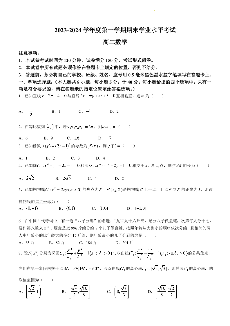 江苏省东台市2023-2024学年高二上学期期末考试数学+答案