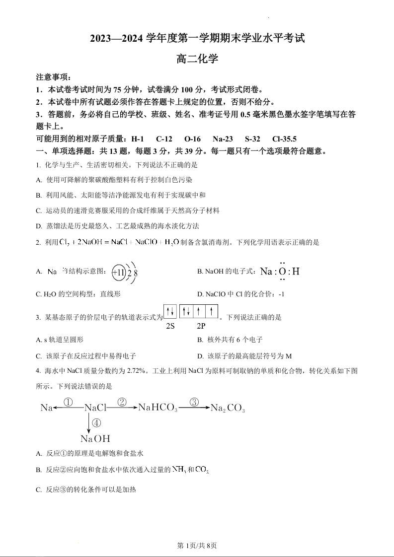 江苏省东台市2023-2024学年高二上学期期末考试化学(原卷版)
