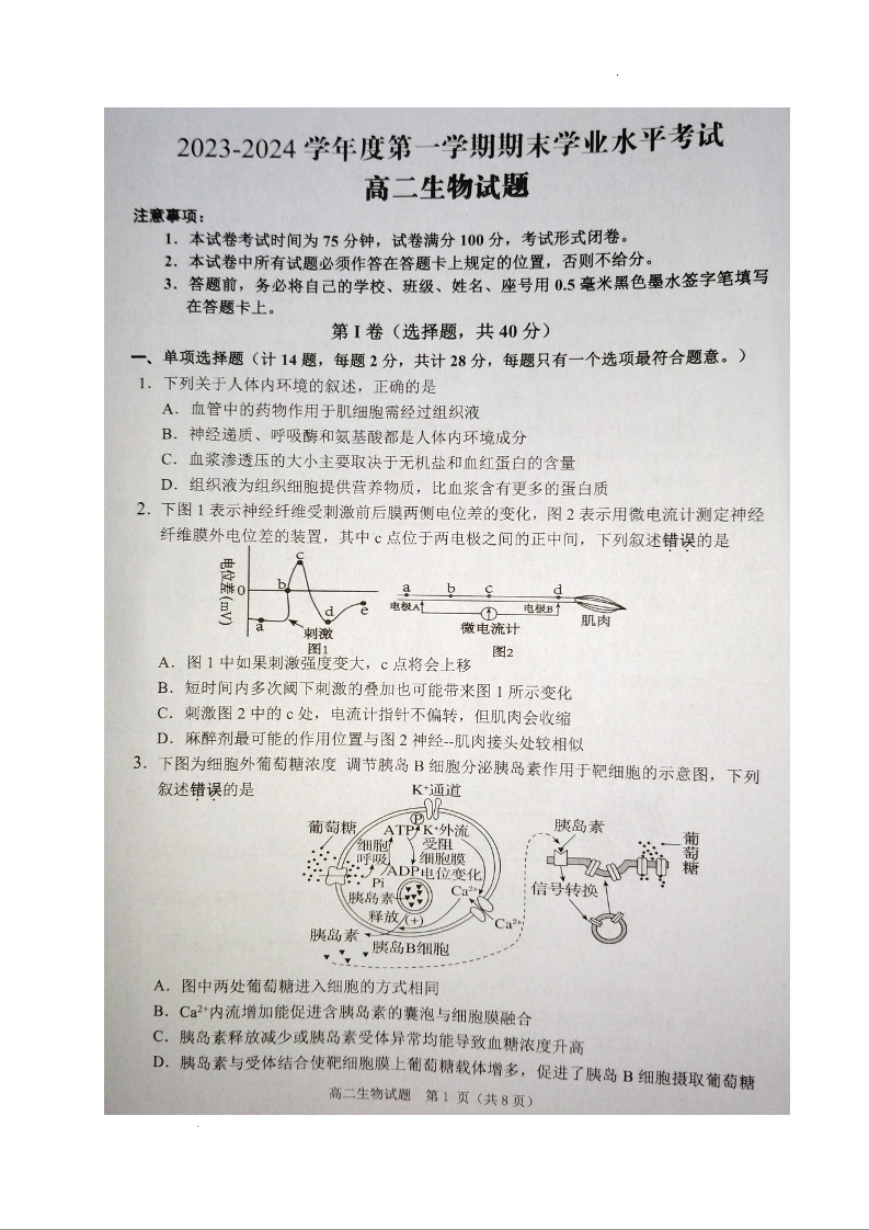 江苏省东台市2023-2024学年高二上学期期末考试生物