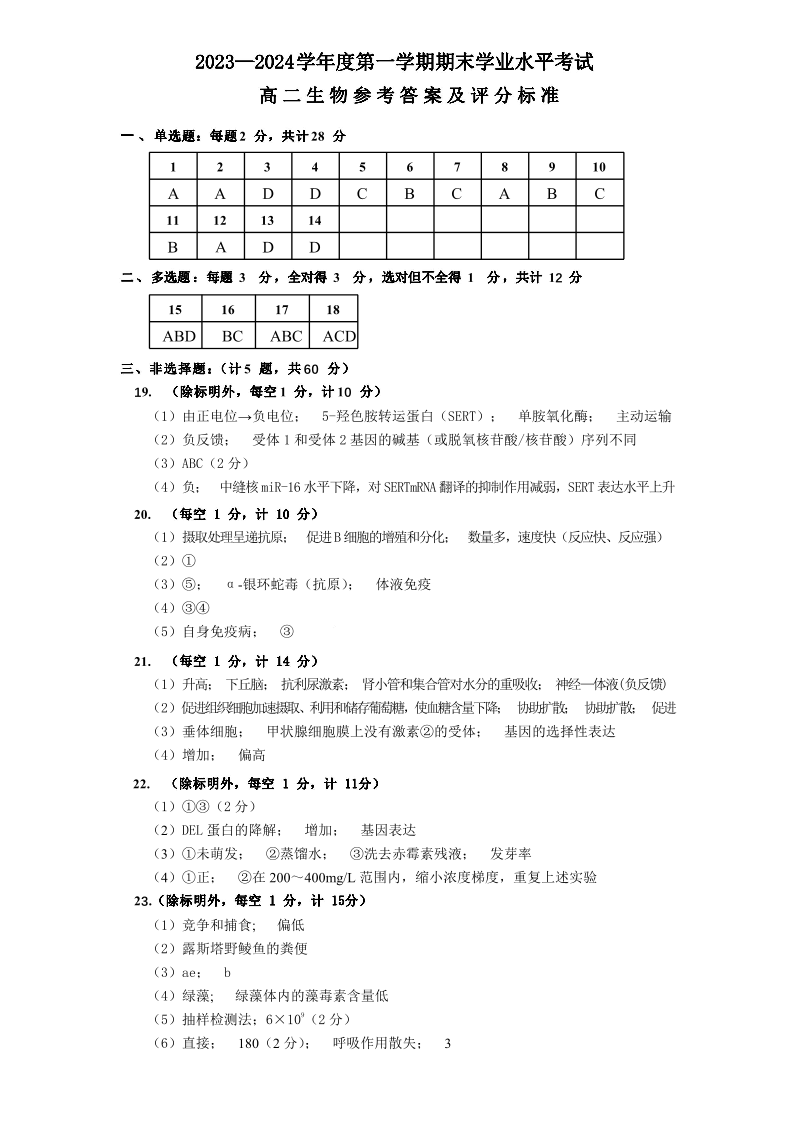 江苏省东台市2023-2024学年高二上学期期末考试生物答案