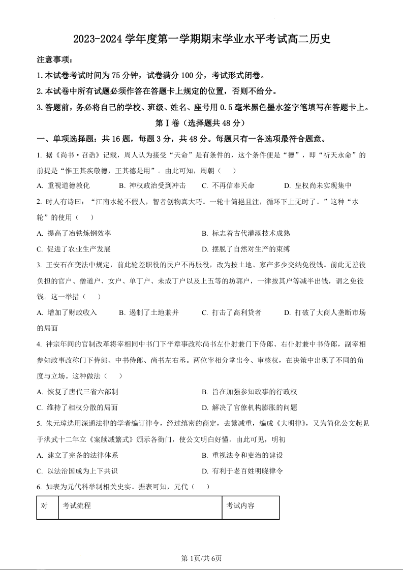 江苏省东台市2023-2024学年高二上学期期末考试历史(原卷版)