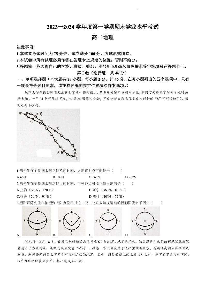 江苏省东台市2023-2024学年高二上学期期末考试地理+答案