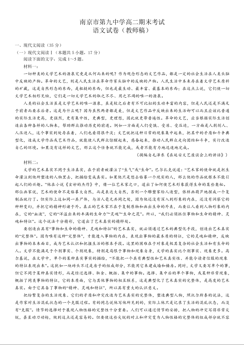 江苏省南京市第九中学2023-2024学年高二上学期期末考试语文(精品解析版)