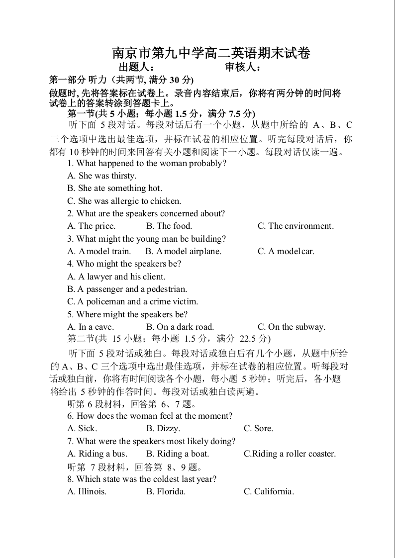 江苏省南京市第九中学2023-2024学年高二上学期期末考试英语