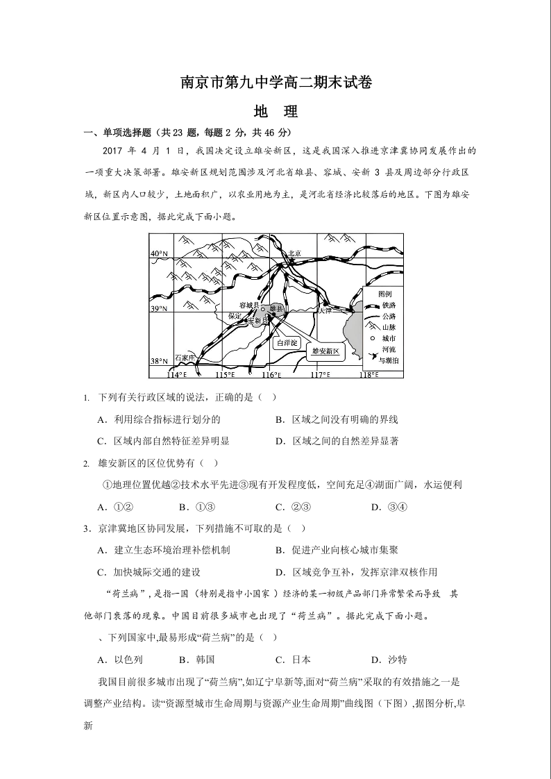 江苏省南京市第九中学2023-2024学年高二上学期期末考试地理