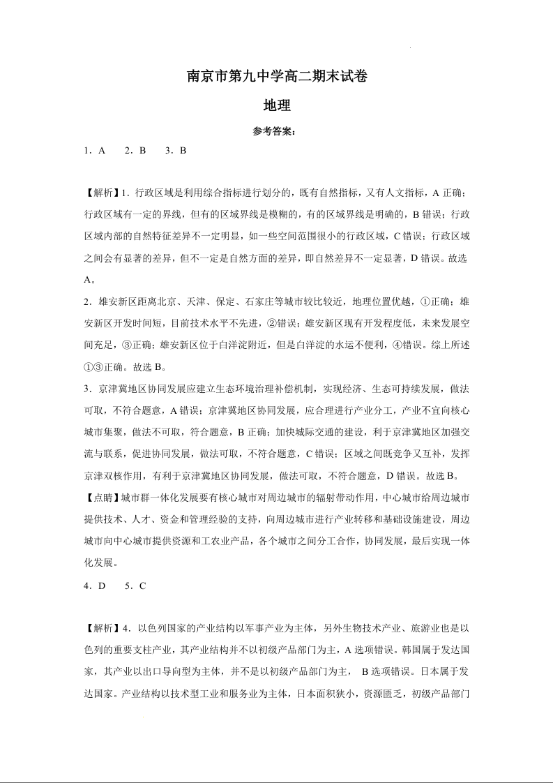 江苏省南京市第九中学2023-2024学年高二上学期期末考试地理答案