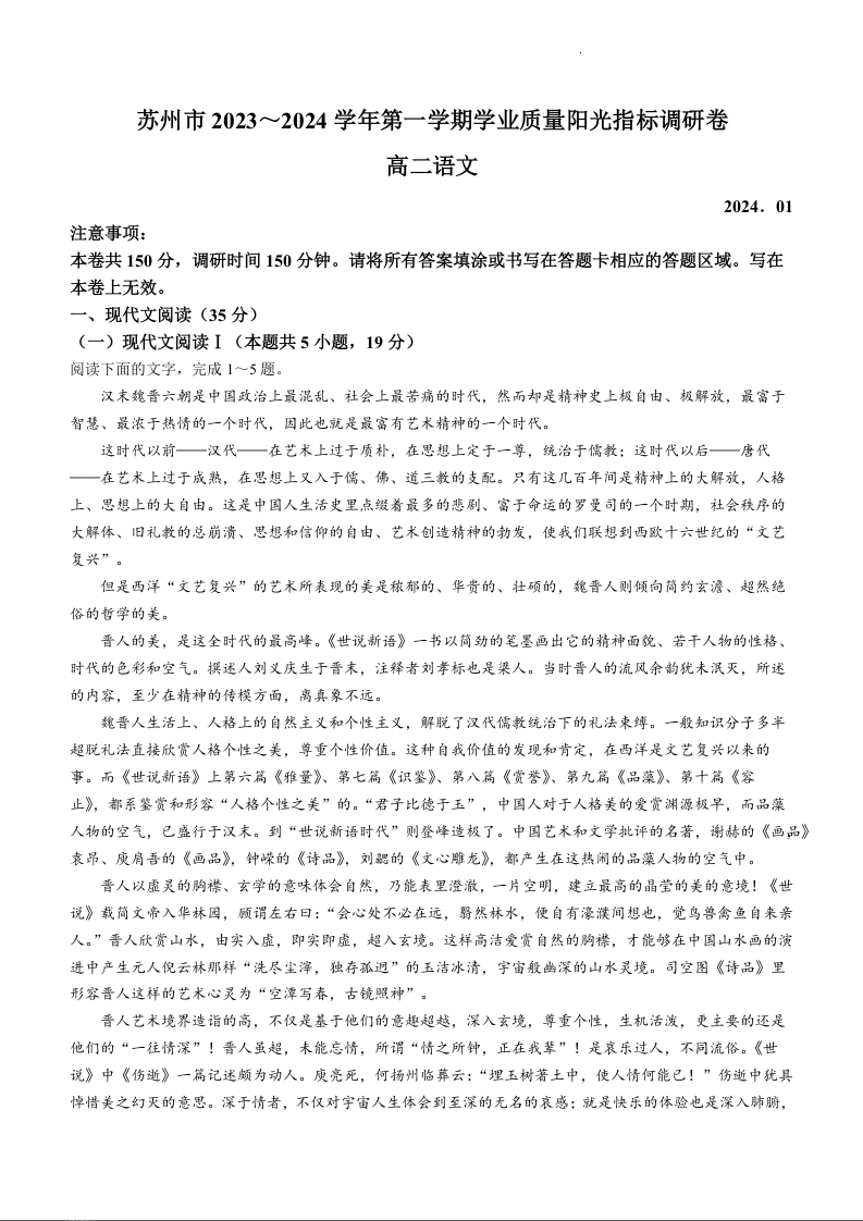 江苏省苏州市2023-2024学年高二上学期期末学业质量阳光指标调研考试语文