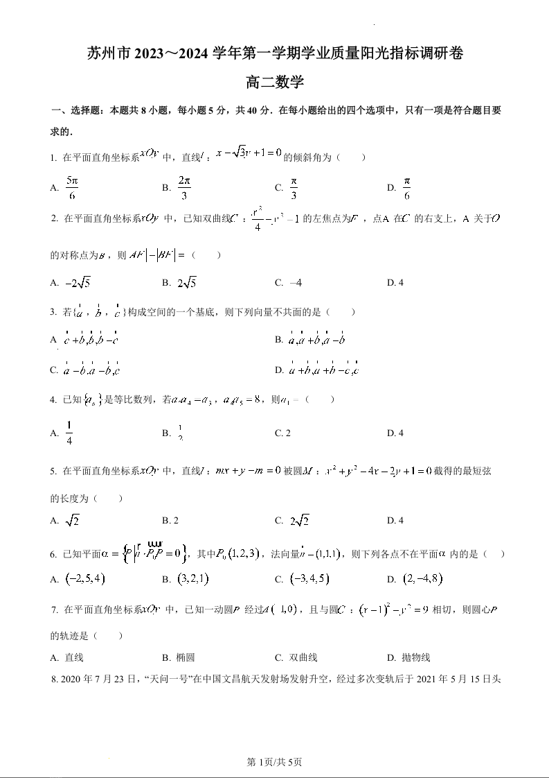 江苏省苏州市2023-2024学年高二上学期期末学业质量阳光指标调研考试数学(原卷版)