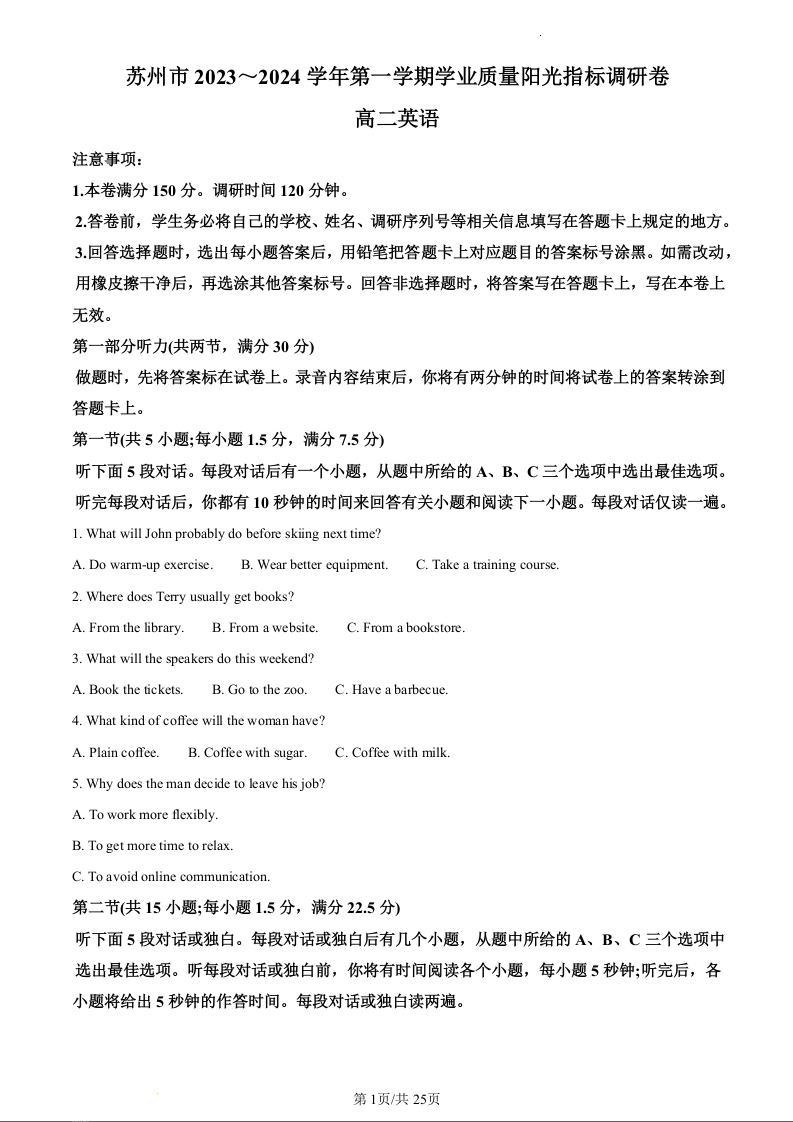江苏省苏州市2023-2024学年高二上学期期末学业质量阳光指标调研考试英语(精品解析版)