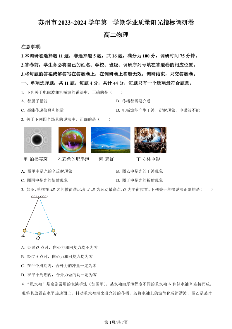 江苏省苏州市2023-2024学年高二上学期期末学业质量阳光指标调研考试物理(原卷版)