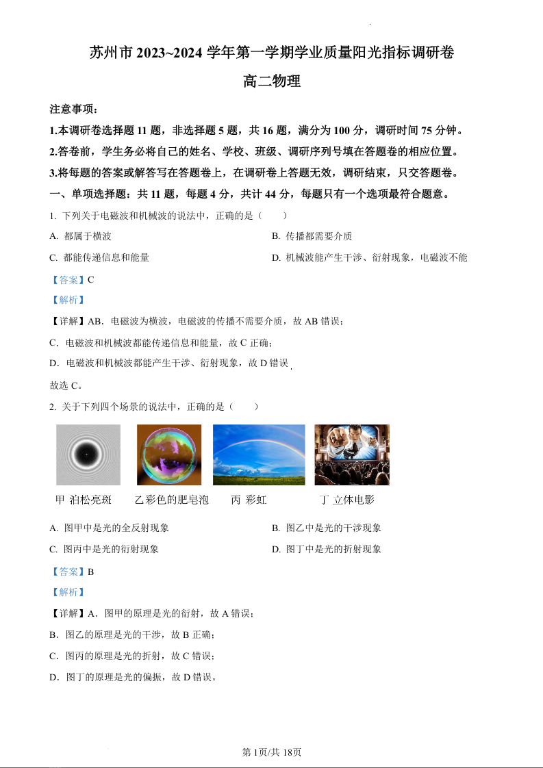 江苏省苏州市2023-2024学年高二上学期期末学业质量阳光指标调研考试物理(精品解析版)