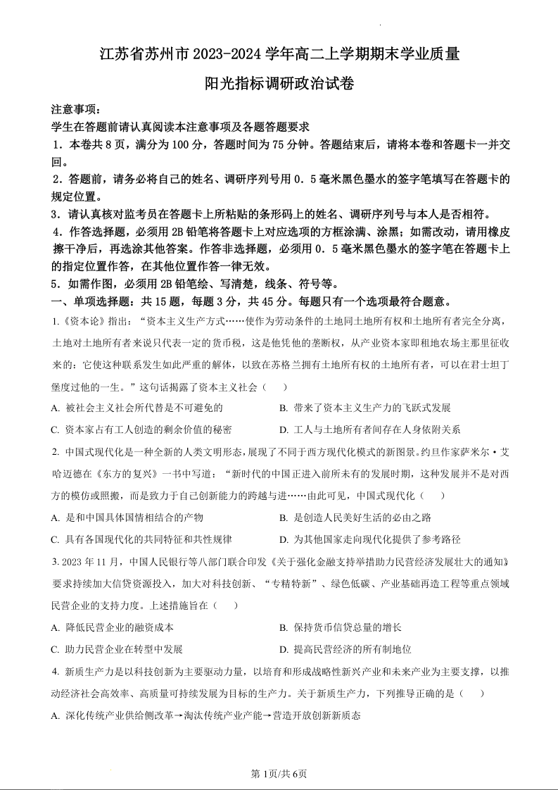 江苏省苏州市2023-2024学年高二上学期期末学业质量阳光指标调研考试政治(原卷版)