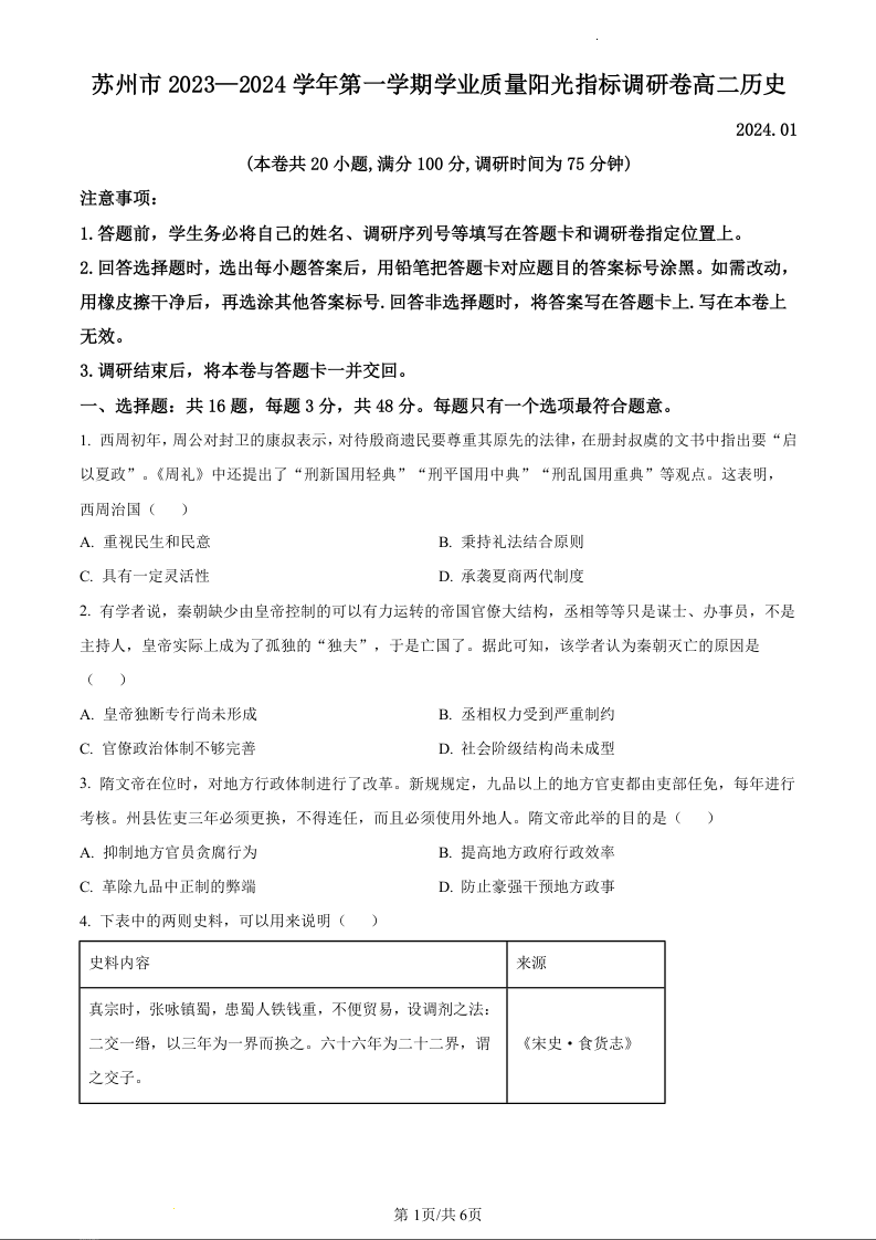 江苏省苏州市2023-2024学年高二上学期期末学业质量阳光指标调研考试历史(原卷版)