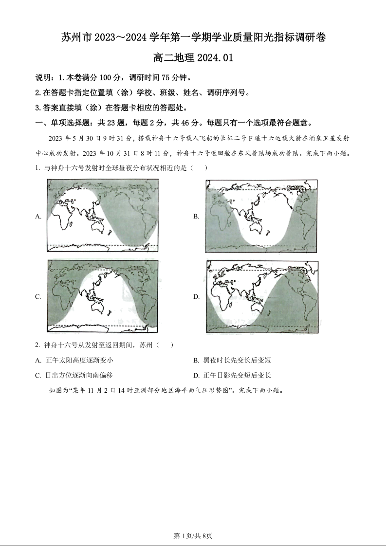 江苏省苏州市2023-2024学年高二上学期期末学业质量阳光指标调研考试地理(原卷版)