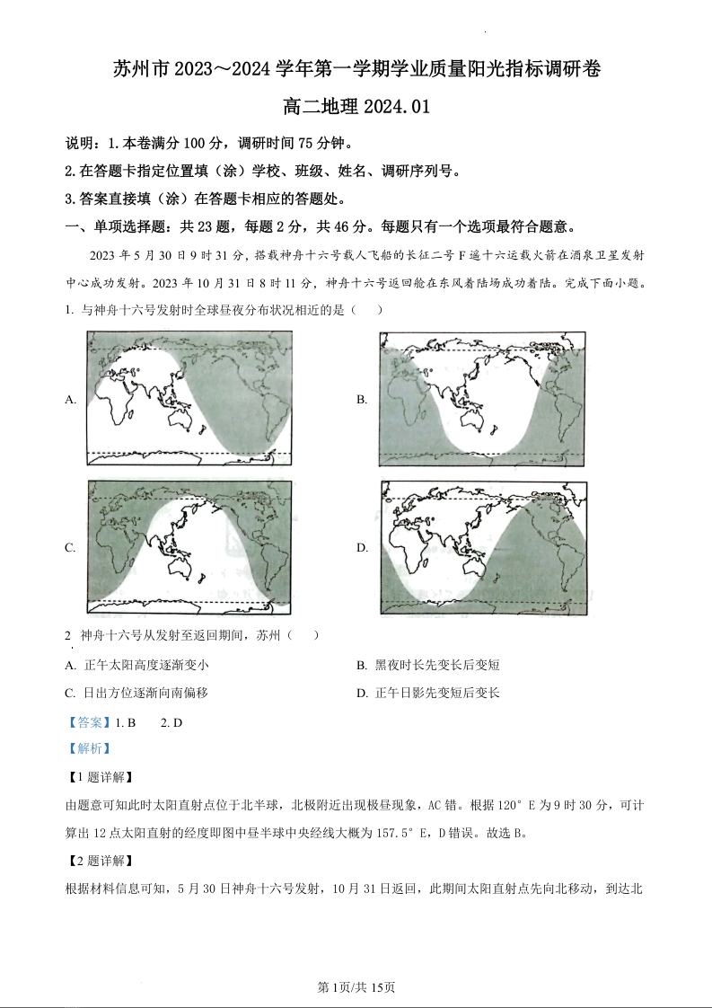 江苏省苏州市2023-2024学年高二上学期期末学业质量阳光指标调研考试地理(精品解析版)