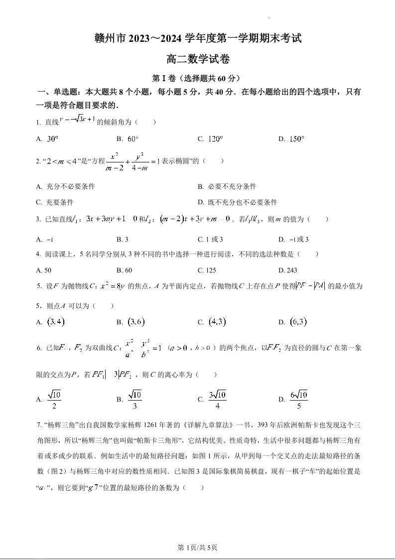 江西省赣州市2023-2024学年高二上学期期末考试数学(原卷版)