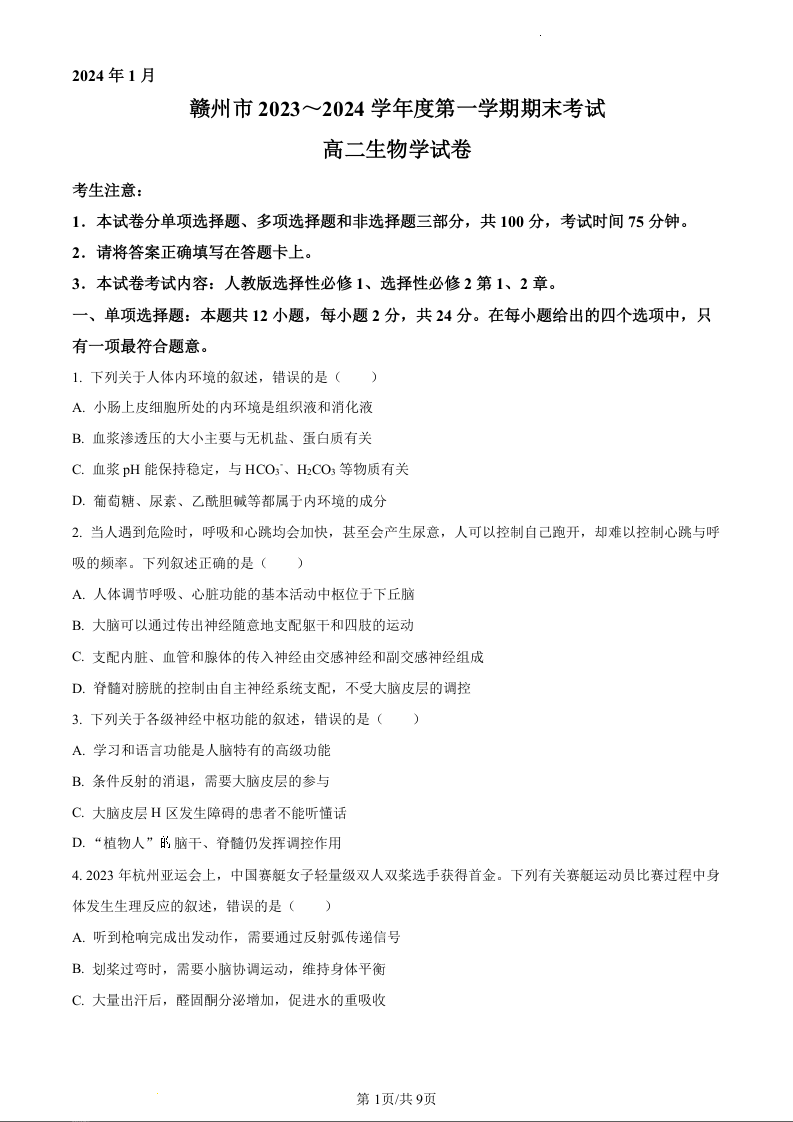 江西省赣州市2023-2024学年高二上学期期末考试生物(原卷版)