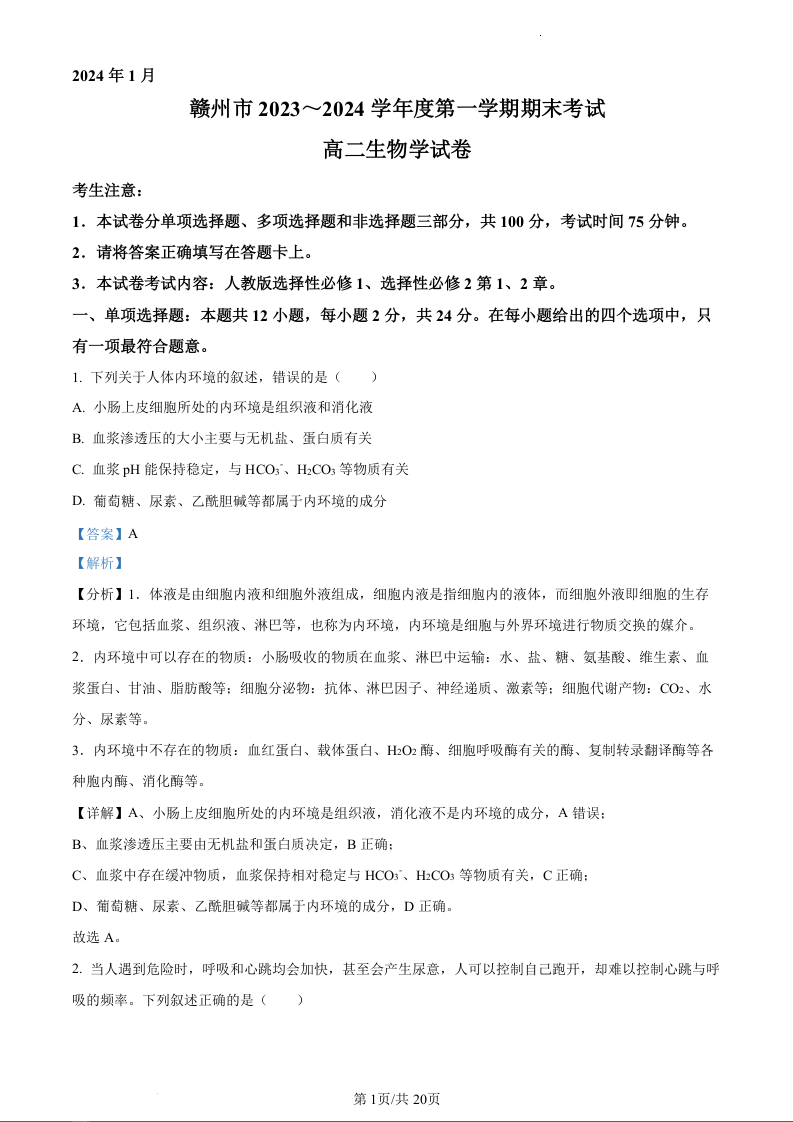 江西省赣州市2023-2024学年高二上学期期末考试生物(精品解析版)