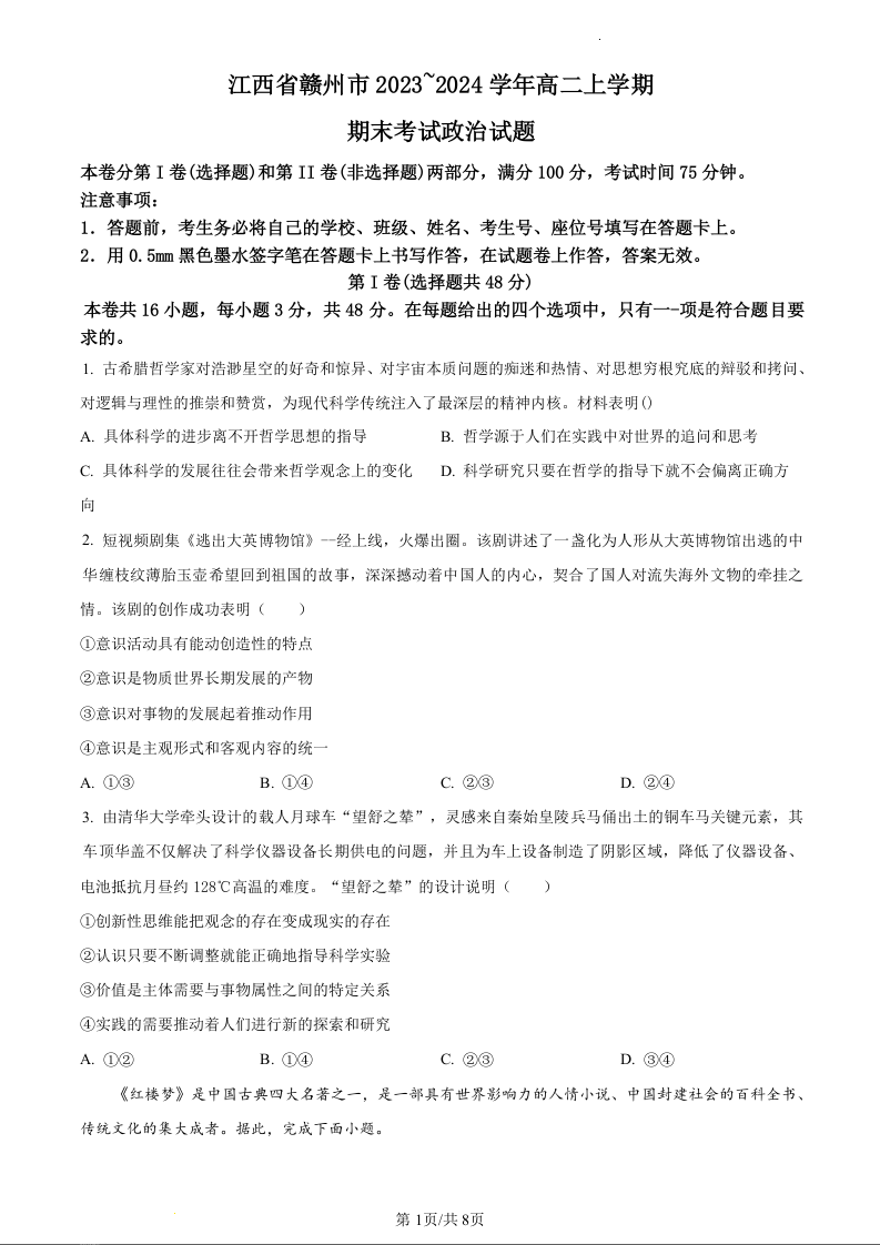 江西省赣州市2023-2024学年高二上学期期末考试政治(原卷版)