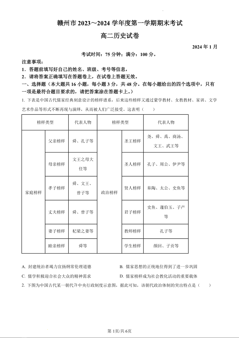 江西省赣州市2023-2024学年高二上学期期末考试历史(原卷版)