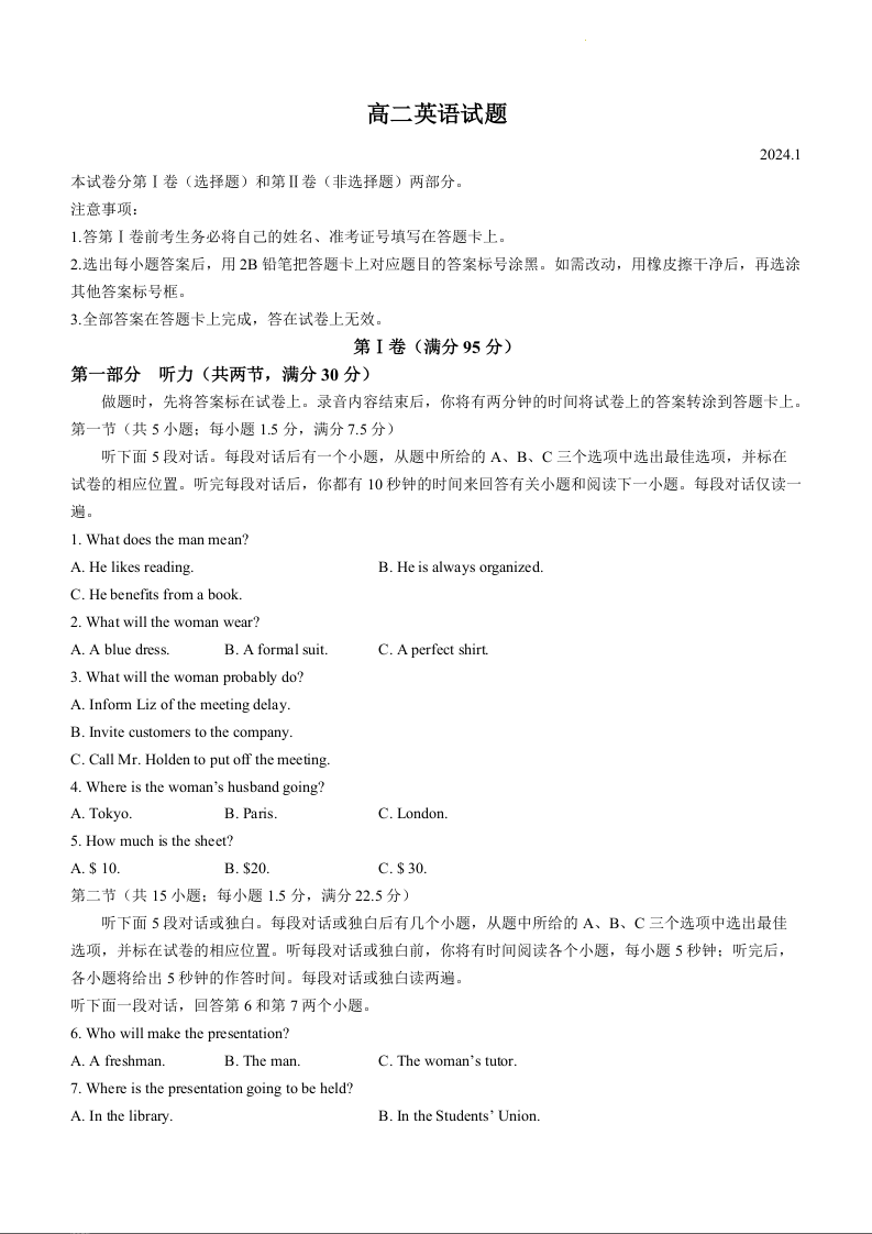 山东省德州市2023-2024学年高二上学期期末考试英语+答案