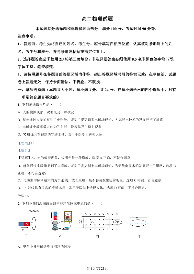 山东省德州市2023-2024学年高二上学期期末考试物理(精品解析版)