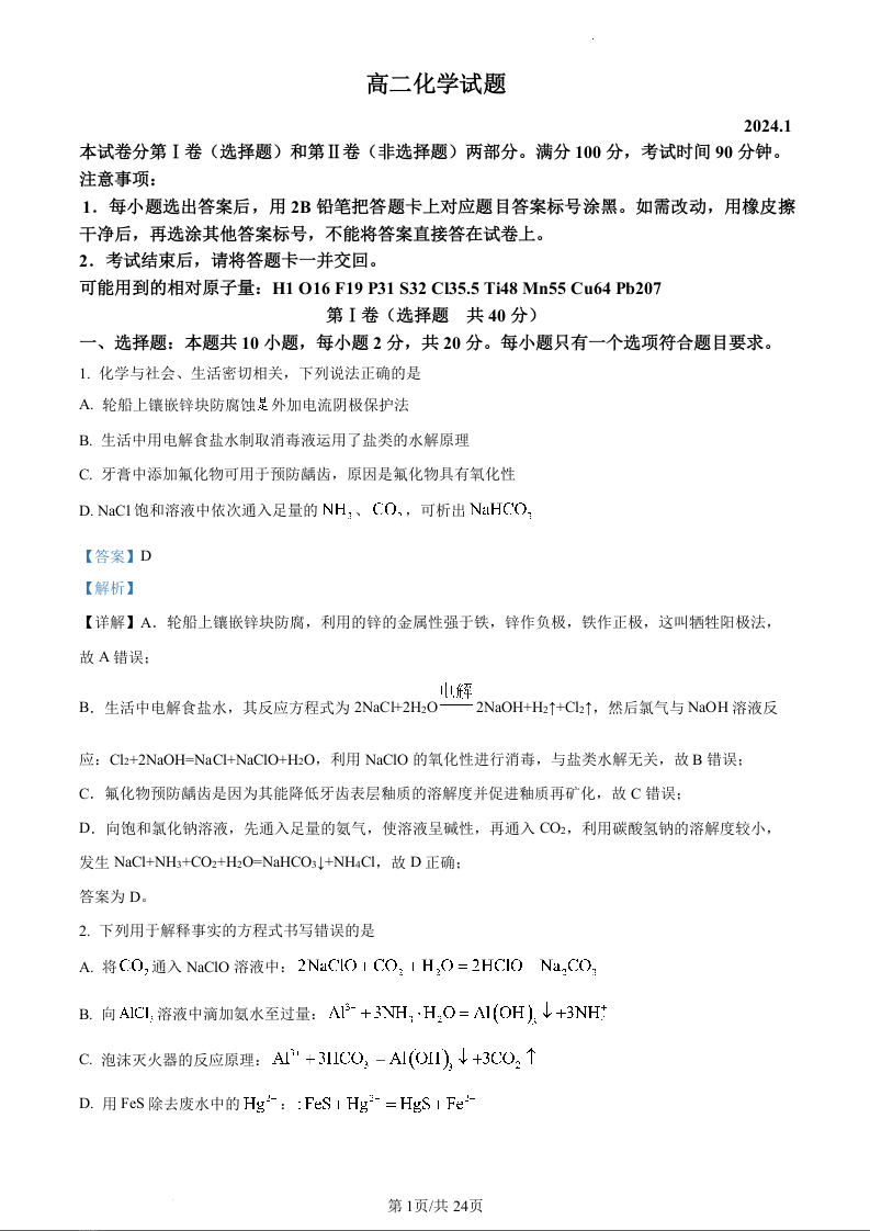 山东省德州市2023-2024学年高二上学期期末考试化学(精品解析版)