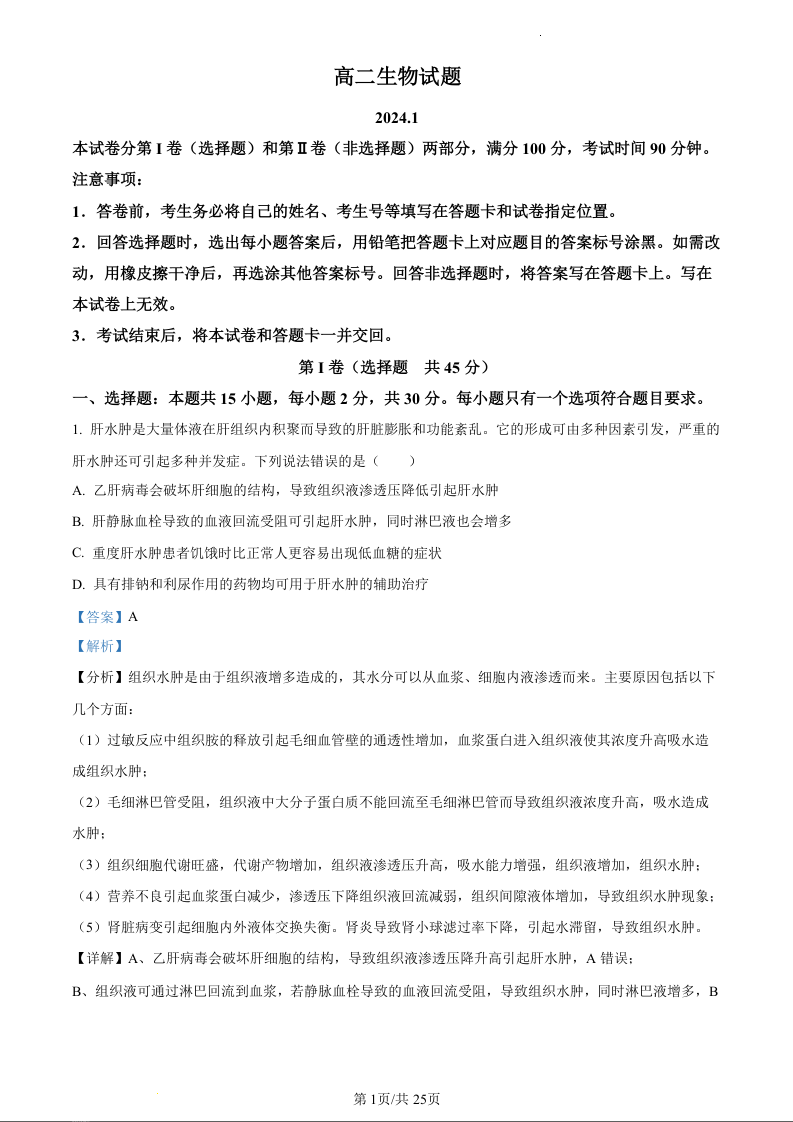 山东省德州市2023-2024学年高二上学期期末考试生物(精品解析版)