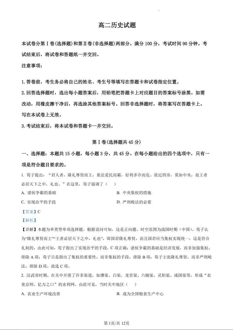 山东省德州市2023-2024学年高二上学期期末考试历史(精品解析版)