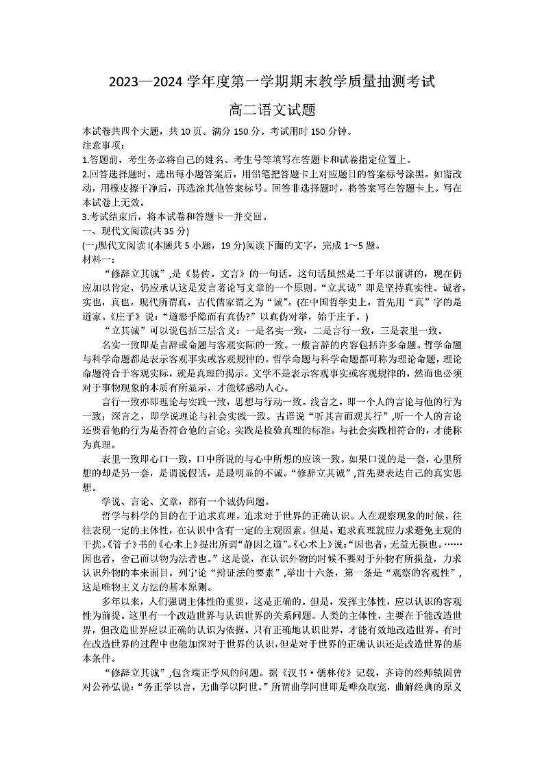 山东省聊城市2023-2024学年高二上学期1月期末考试语文+答案