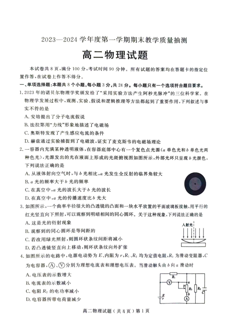 山东省聊城市2023-2024学年高二上学期1月期末考试物理
