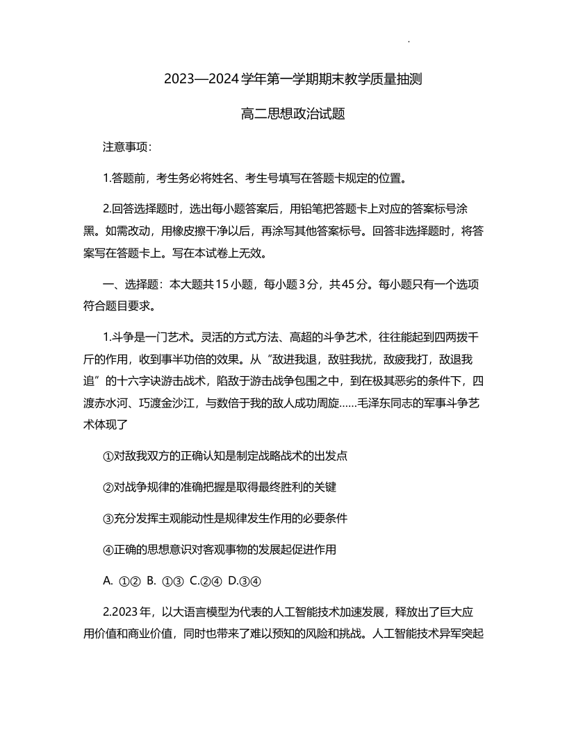 山东省聊城市2023-2024学年高二上学期1月期末考试政治