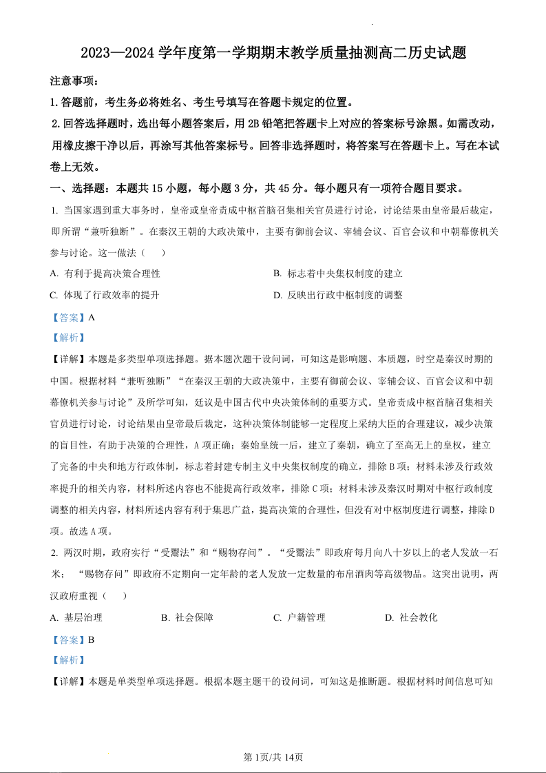 山东省聊城市2023-2024学年高二上学期1月期末考试历史(精品解析版)