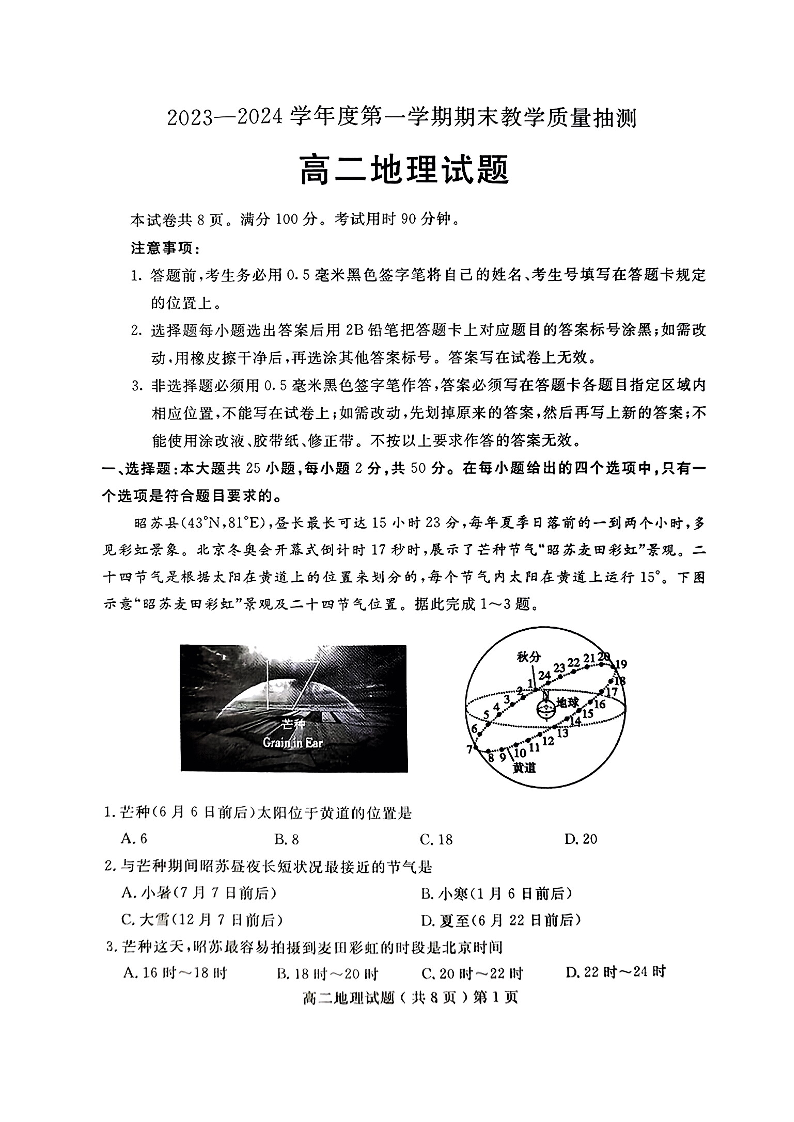 山东省聊城市2023-2024学年高二上学期1月期末考试地理+答案
