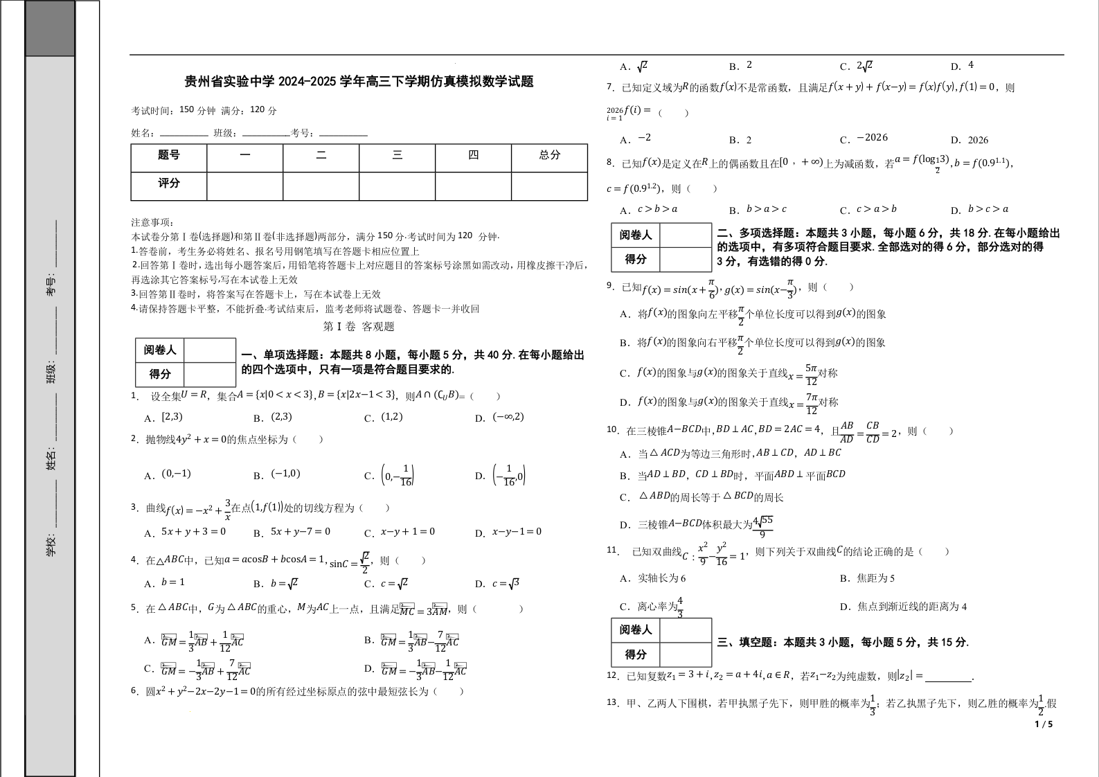 贵州省实验中学2024-2025学年下学期高三仿真模拟数学+答案