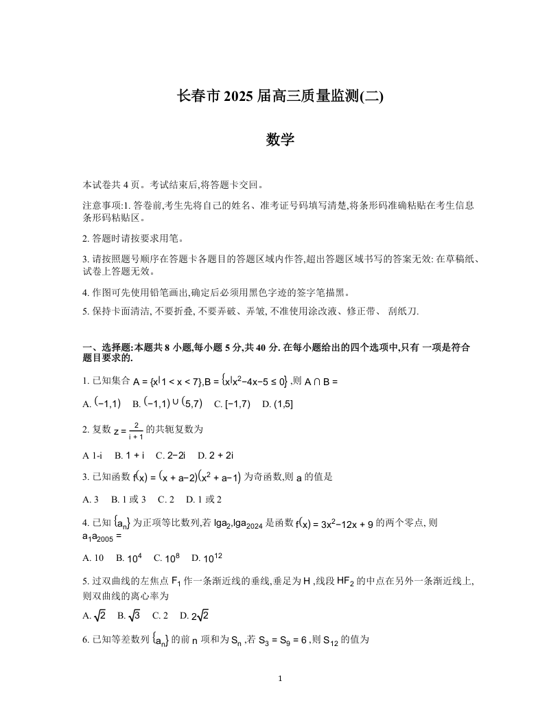 吉林省长春市2024-2025学年下学期高三质量监测(二模)数学+答案