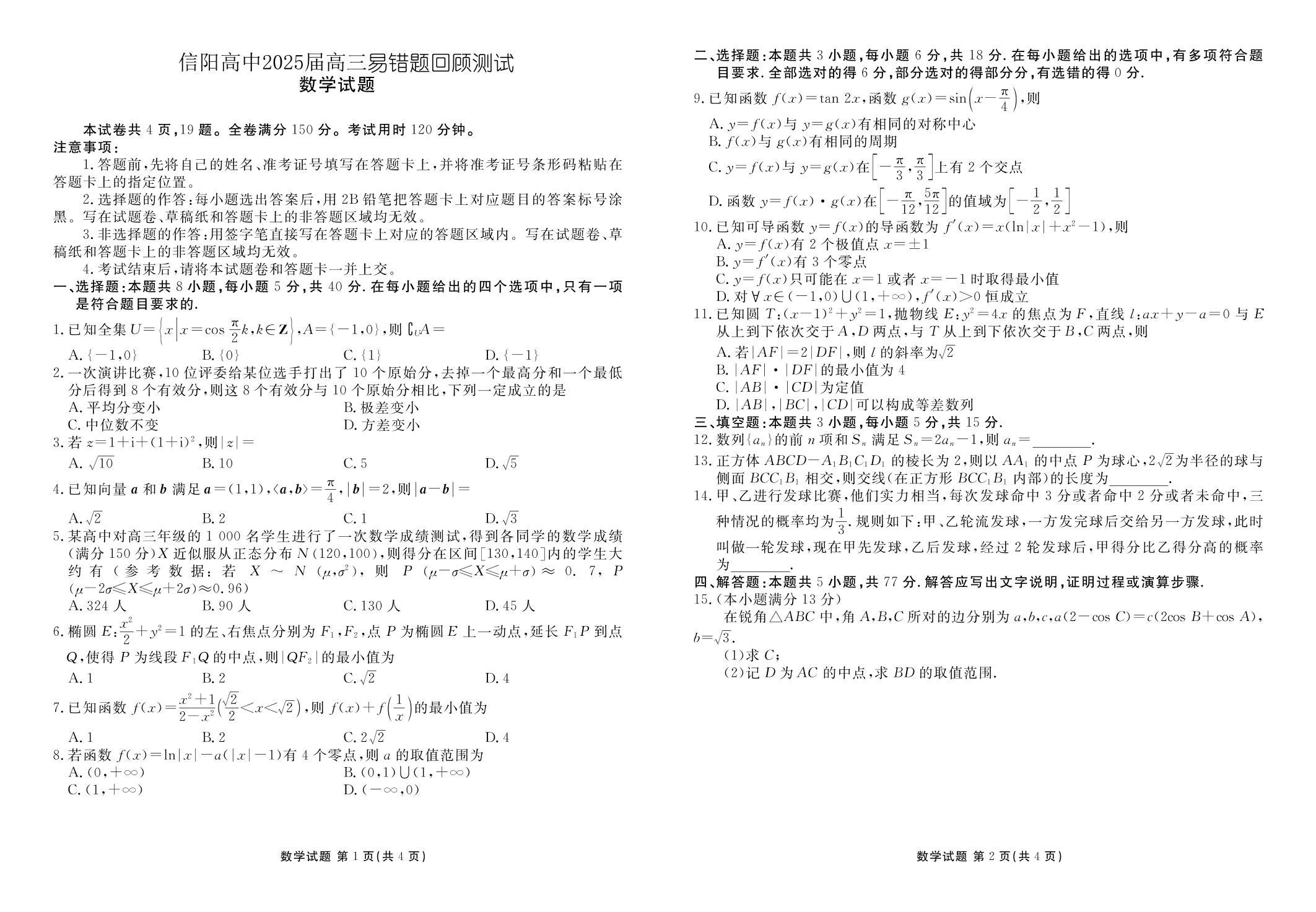 河南省信阳市高级中学2024-2025学年下学期高三易错题回顾测试数学