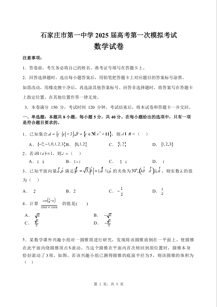 河北省石家庄市一中2024-2025学年下学期高三第一次模拟考试数学