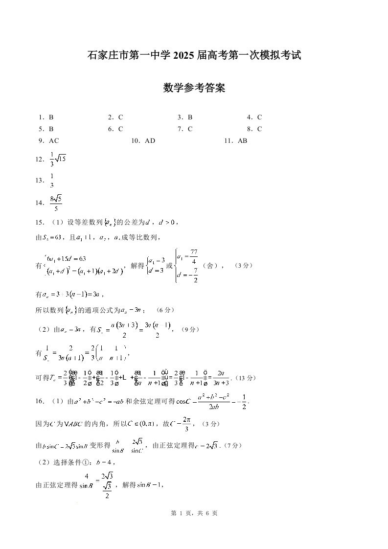河北省石家庄市一中2024-2025学年下学期高三第一次模拟考试数学答案