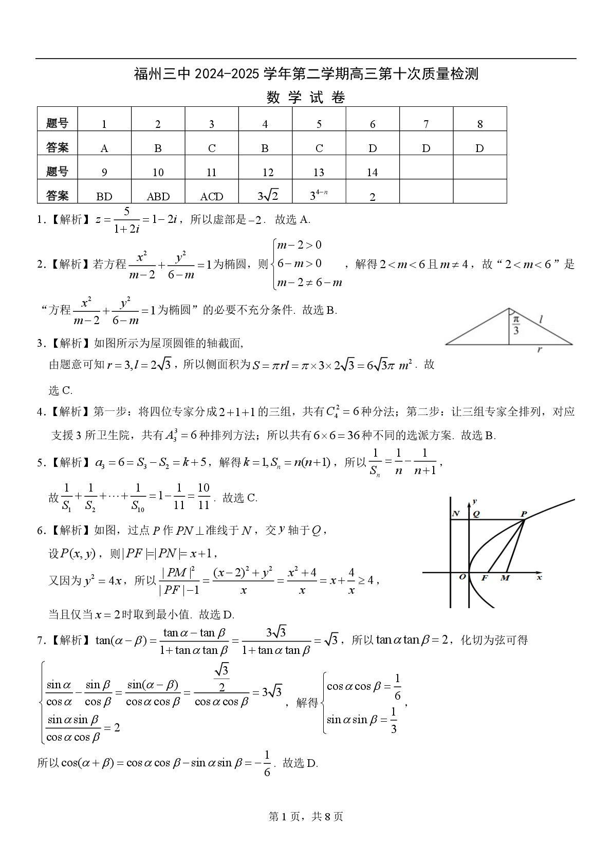 福建省福州第三中学2024-2025学年下学期高三第十次质量检测数学答案