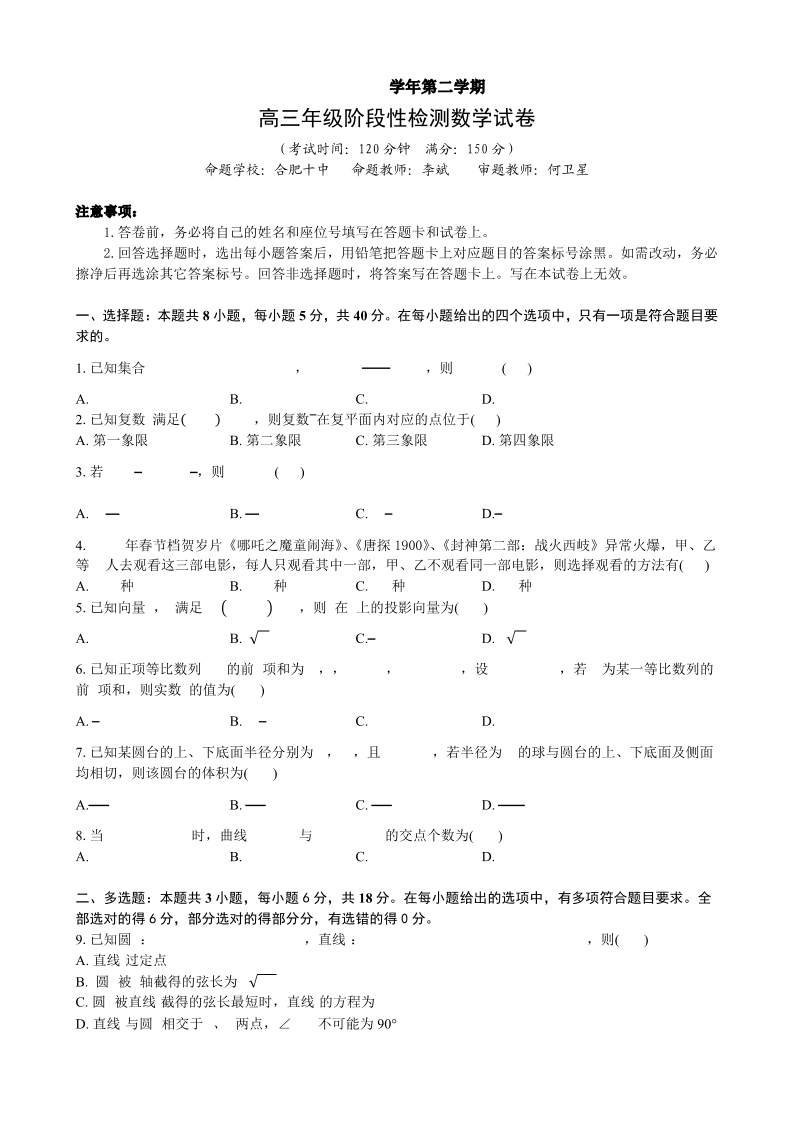 安徽省合肥市六校联盟2024-2025学年下学期高三阶段性检测数学