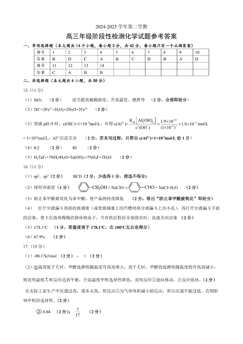安徽省合肥市六校联盟2024-2025学年下学期高三阶段性检测化学答案