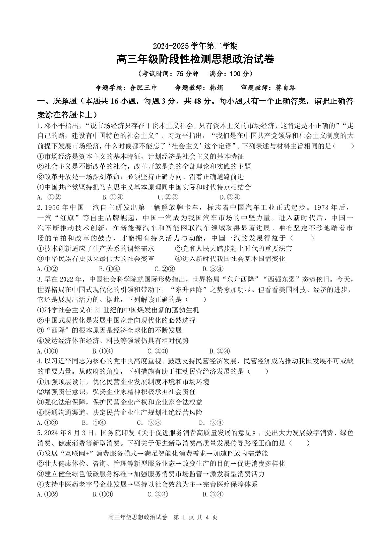 安徽省合肥市六校联盟2024-2025学年下学期高三阶段性检测政治