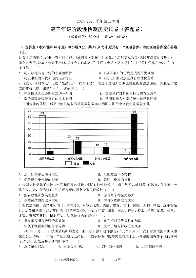 安徽省合肥市六校联盟2024-2025学年下学期高三阶段性检测历史