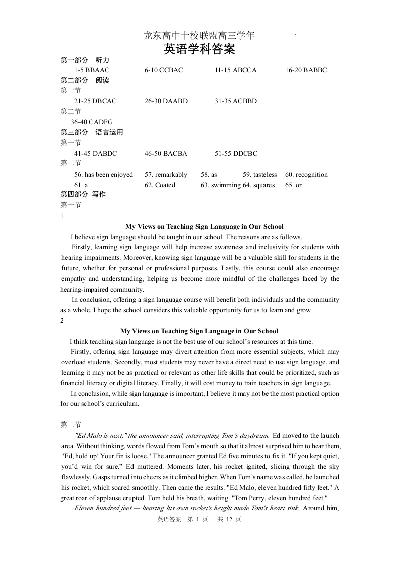 黑龙江省龙东十校联盟2024-2025学年下学期2月高三适应性考试英语答案