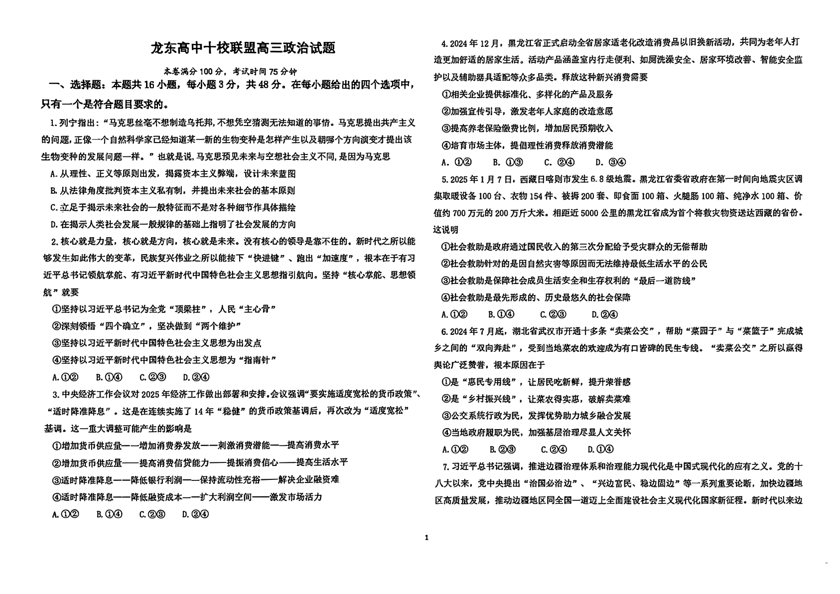 黑龙江省龙东十校联盟2024-2025学年下学期2月高三适应性考试政治