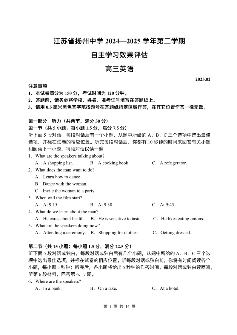 江苏省扬州中学2024-2025学年下学期2月高三月考英语+答案