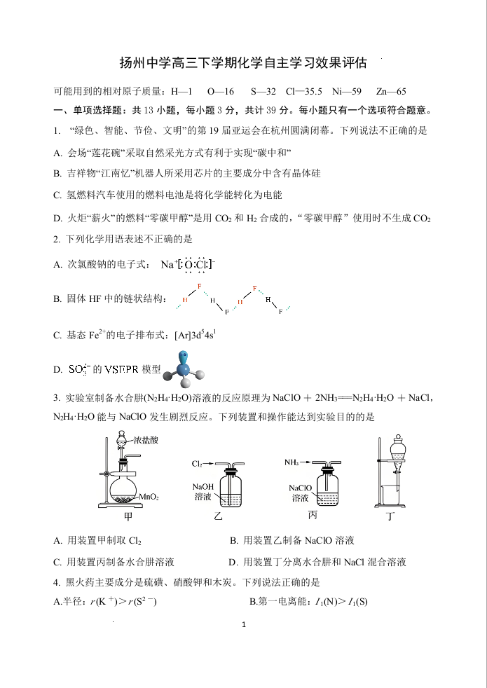 江苏省扬州中学2024-2025学年下学期2月高三月考化学+答案